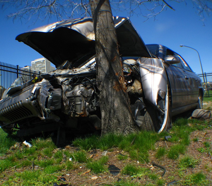 crash - To hit something with force, causing damage and a loud noise.