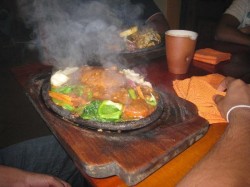 sizzle - (of food) make a hissing sound when frying or cooking