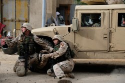 crouch - To adopt a position where the knees are bent and the upper body is brought forward and down, sometimes to avoid detection or to defend oneself